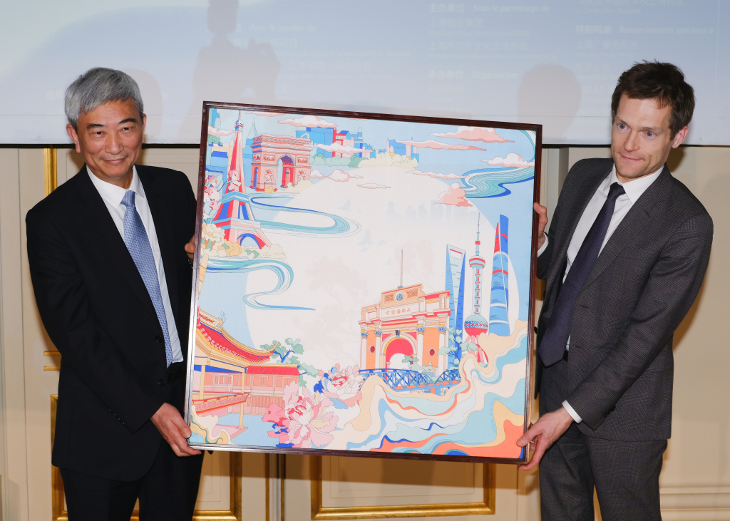 在《奔流》第一季巴黎场,上海静安区政协主席丁宝定向巴黎拉德芳斯代表皮埃尔-伊夫·吉斯(Pierre-Yves Guice)赠送“两河对话”主题丝巾。张轩石 摄